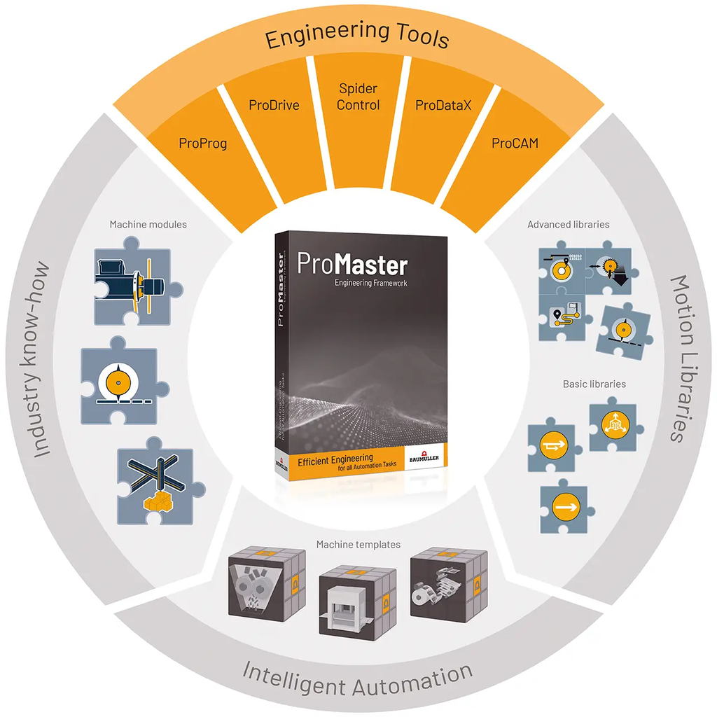 ProMaster chứa các công cụ để giải quyết tất cả các tác vụ tự động hóa: từ thiết kế truyền động đến tham số hóa, lập trình bộ điều khiển, tham số hóa fieldbus cho đến trực quan hóa. Điều này áp dụng trong toàn bộ vòng đời, không chỉ trong quá trình lập kế hoạch và vận hành ban đầu mà còn trong quá trình bảo trì.
