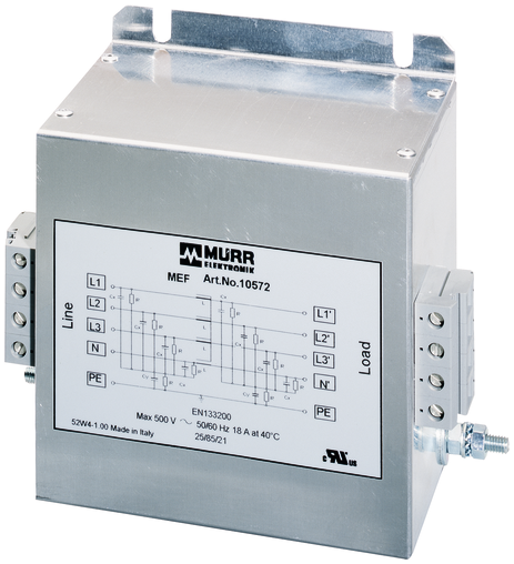 Bộ lọc nhiễu EMC Murrelektronik 3 pha, 1 tầng có dây trung tính (MEF EMC-FILTER 3-PHASE 1-STAGE WITH NEUTRAL, Art.No. 10574) là thiết bị chuyên dùng để giảm thiểu tín hiệu nhiễu điện từ (EMC) phát sinh trên đường nguồn ba pha có dây trung tính.