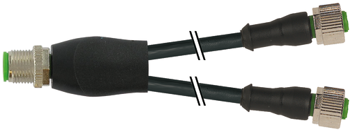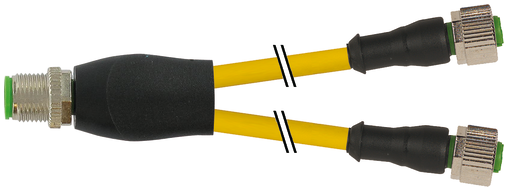 Bộ chia tín hiệu hình chữ Y với một đầu M12 male A-coded và hai đầu M12 female A-coded, thiết kế dạng thẳng 0°, chuyên dùng để phân nhánh tín hiệu từ một thiết bị đến hai thiết bị khác trong hệ thống cảm biến – truyền động.